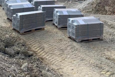 Bereit für den Einbau liegen die Treppenstufen bereit. Zum Einsatz kamen maßgefertigte Winkelstufen mit einer Länge von rund 1,35 m und entsprechend hohem Eigengewicht.