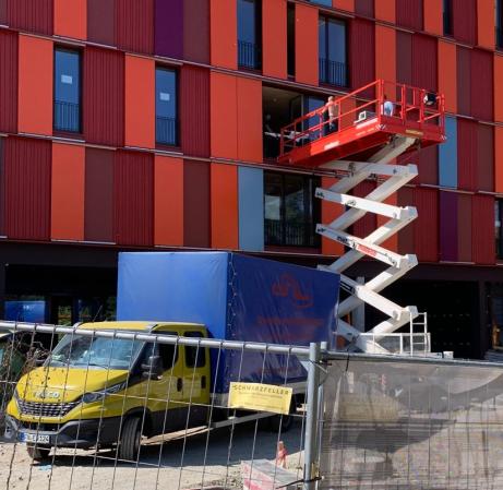 Nach Anlieferung wurden sie mithilfe einer Scherenarbeitsbühne auf die jeweiligen Stockwerke gehoben,